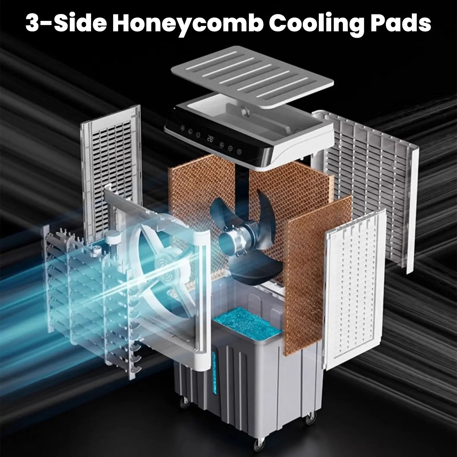 [RAPIDLY CHILLING PERFORMANCE] - This swamp cooler is a beast when it comes to providing a greater airflow! Equipped with 3 upgraded evaporative cooling pads, it maximizes the surface area for evaporation, resulting in icy cold air. Plus, the mighty motors ensure speedy cooling, unleashing a powerful blast of coolness. And with 3 ice packs thrown in, the water gets even colder, effectively reducing the temperature