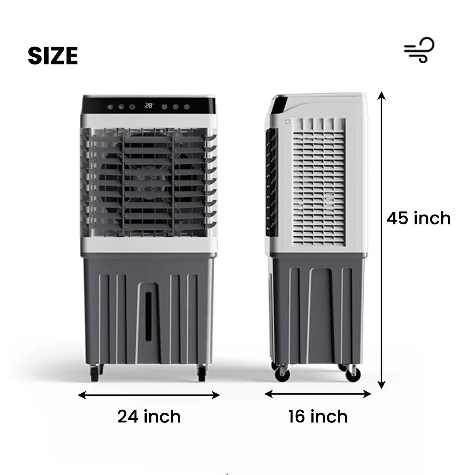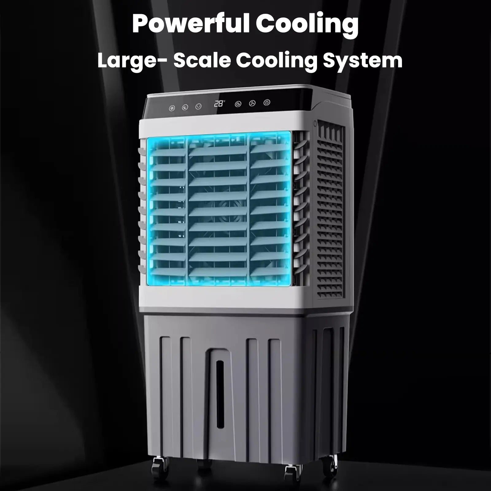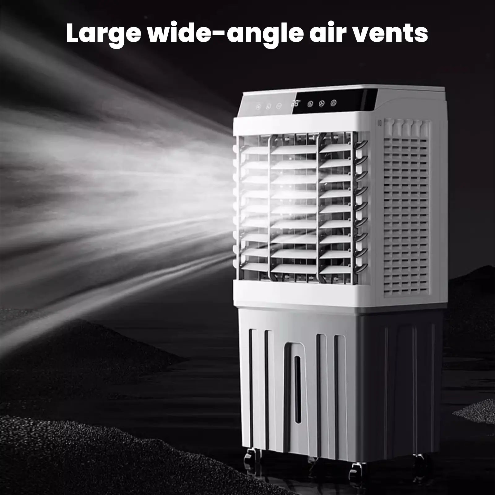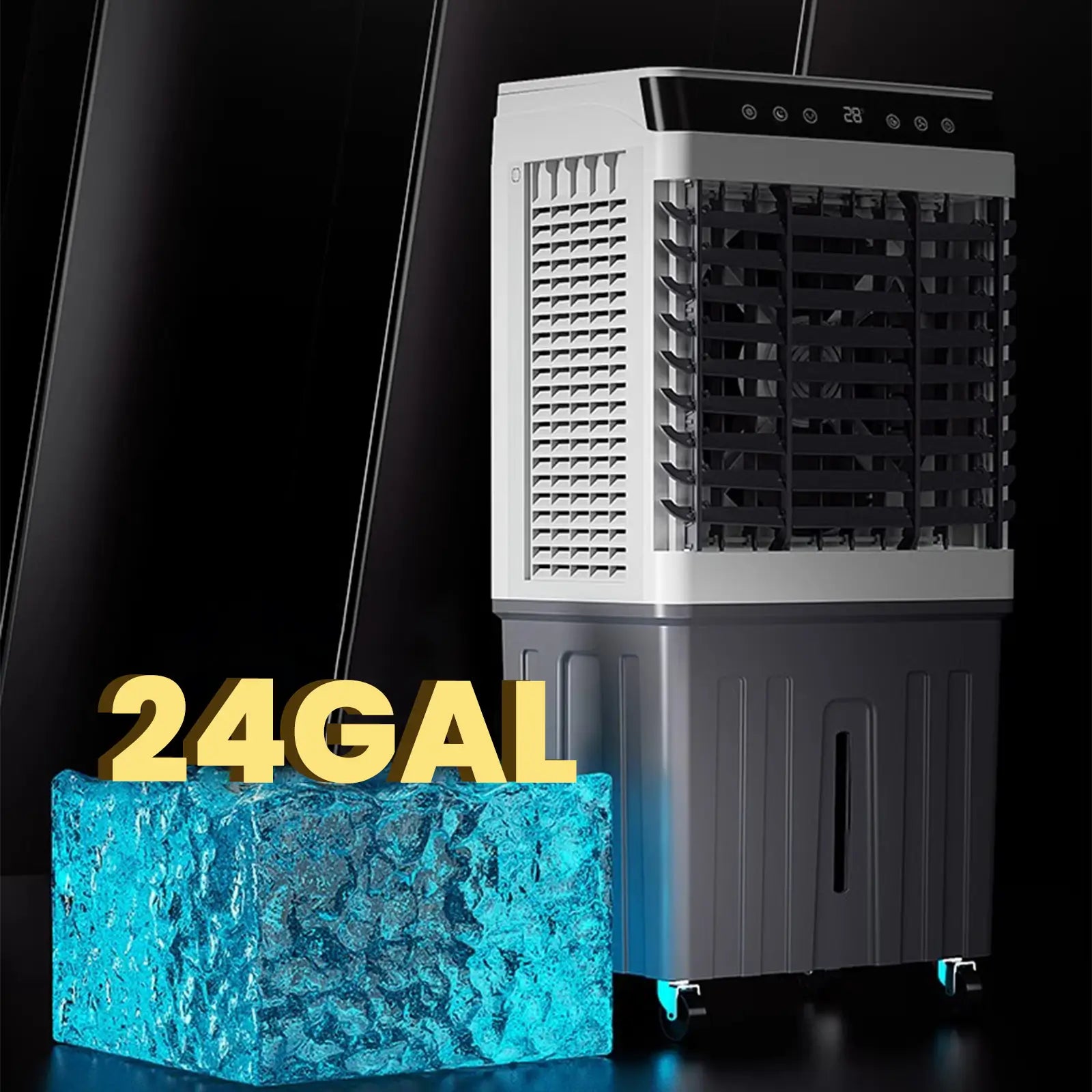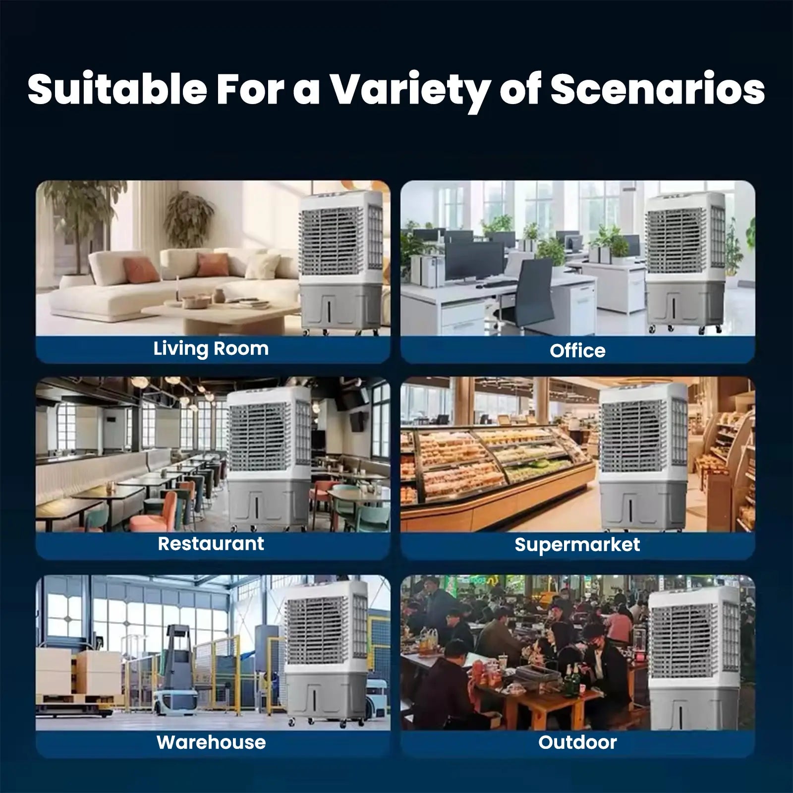 [SEAMLESS MOBILITY with 4 ROLLING CASTERS] - This portable evaporative cooler is not one to be tied down. With 4 universal wheels (2 with brakes, 2 without), it grants you the freedom to move it wherever you desire, be it the backyard, garage, or even a spacious gym. Its enchanting cooling power can even be felt outdoors. Feel the refreshing breeze during scorching summers and relish in the pleasure of coolness.