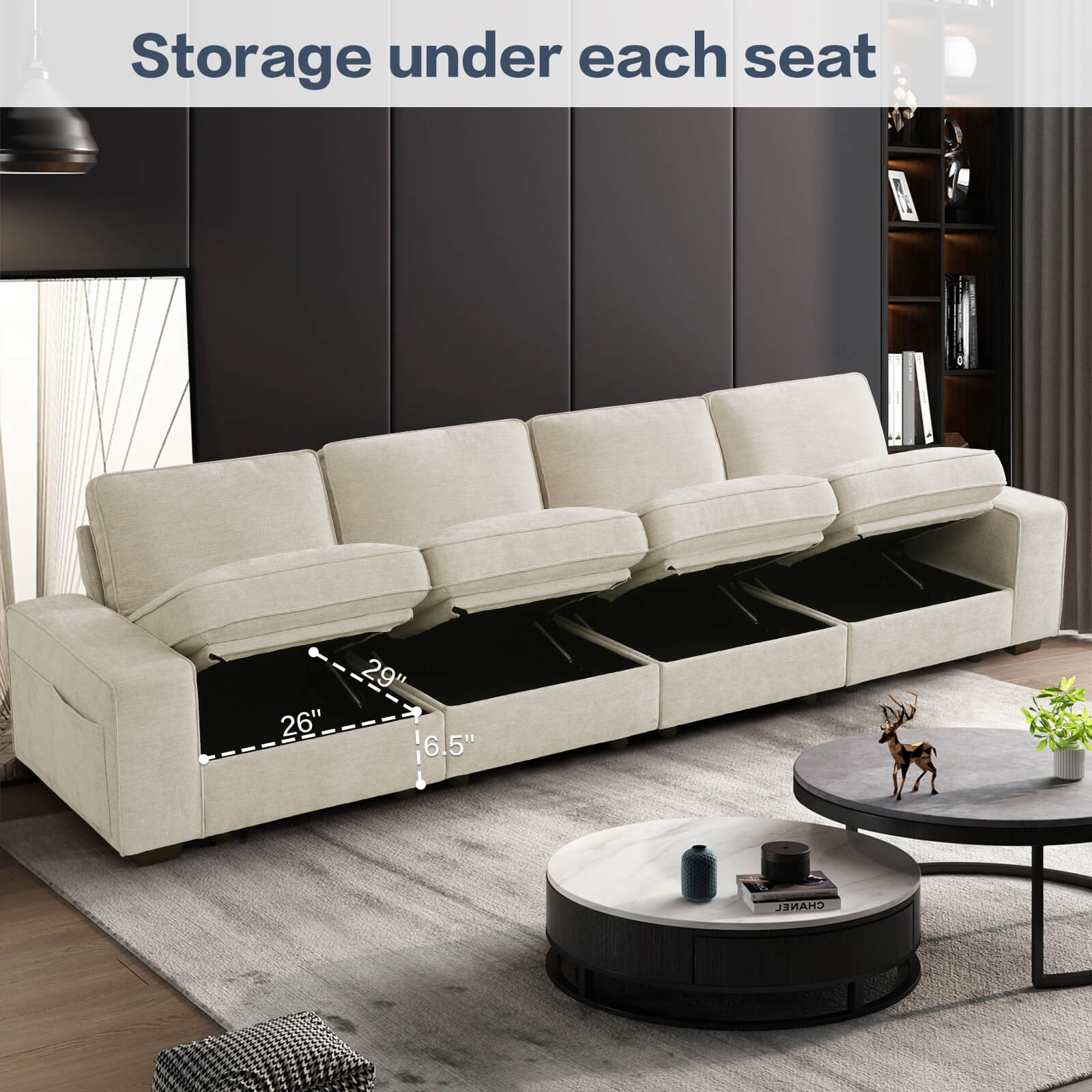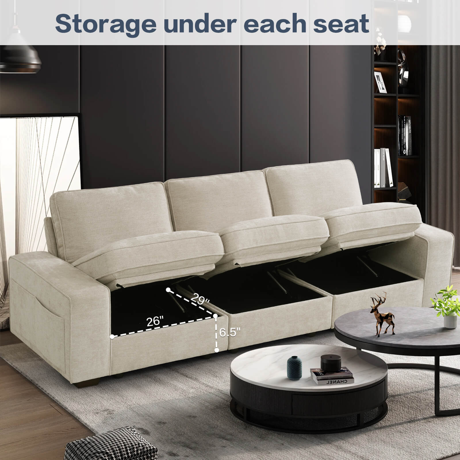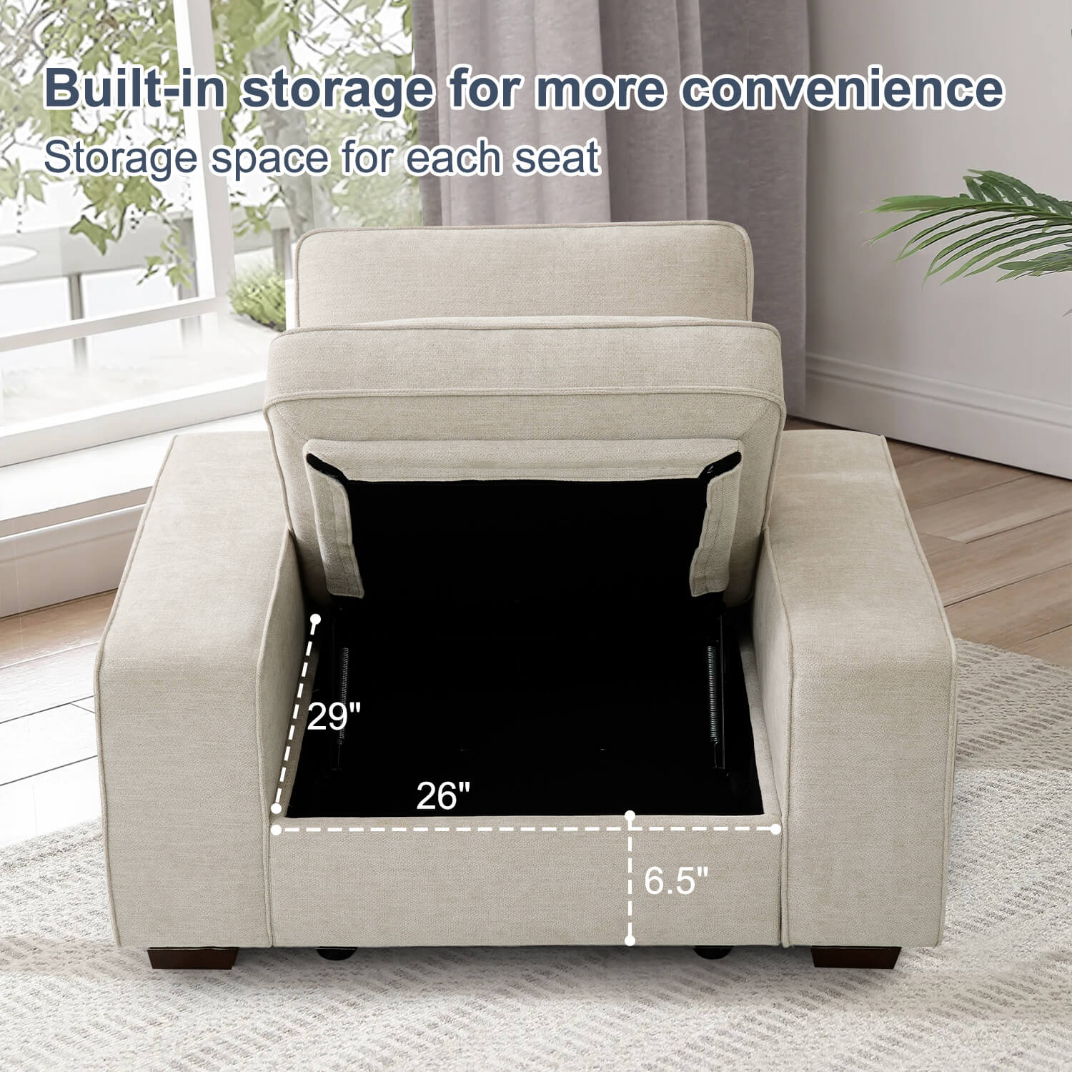 Convenient Storage for All Seats: Storage under each seat offering convenient space for stashing away magazines, blankets, pillows, and more. Enjoy the convenience of keeping your space tidy and organized effortlessly. Storage dimensions: 29"* 26"* 6.5“