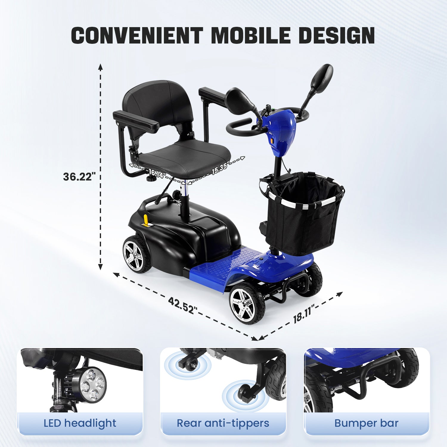 - 【Portable and Foldable】: Foldable 4-Wheel Mobility Scooter,Anyone can fold and disassemble this electric scooter in just 5 minutes. It's simple and fits easily in a car trunk. At its heaviest, it weighs only 77 pounds and measures 42.5 inches long and 16.14 inches wide.